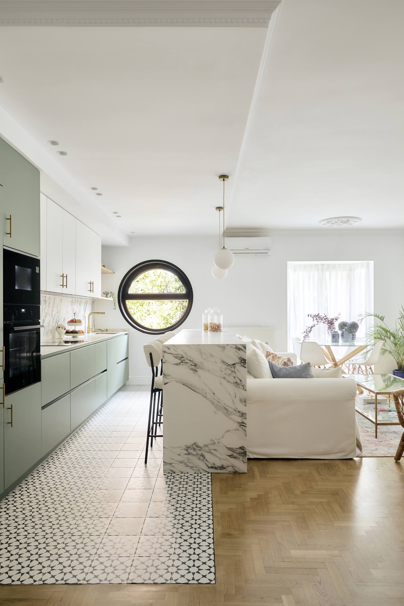 Puedes separar visualmente con islas, penínsulas, muebles bajos o paneles ligeros. Una diferencia de materiales en suelo o techo también ayuda a marcar la transición sin cerrar el espacio.