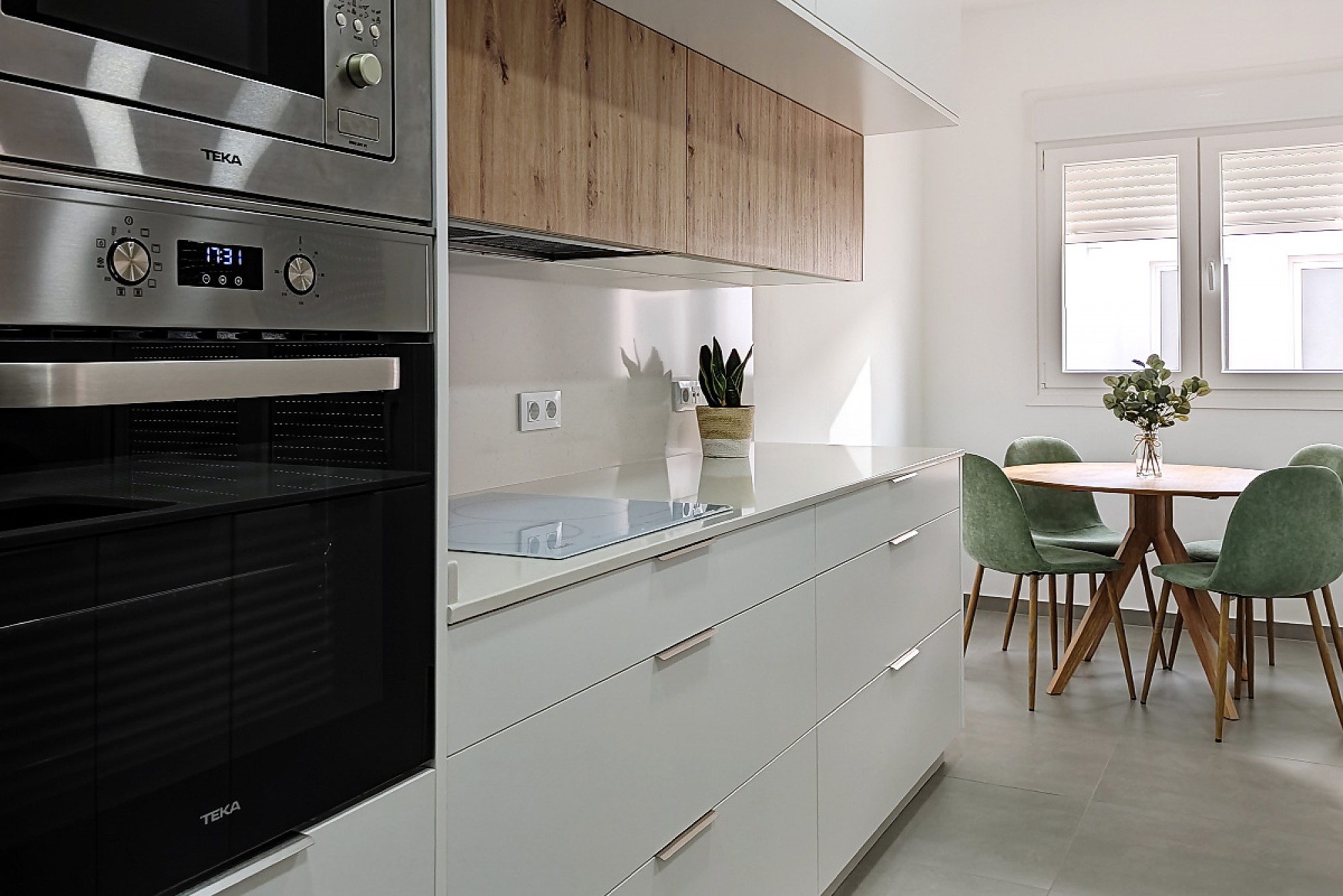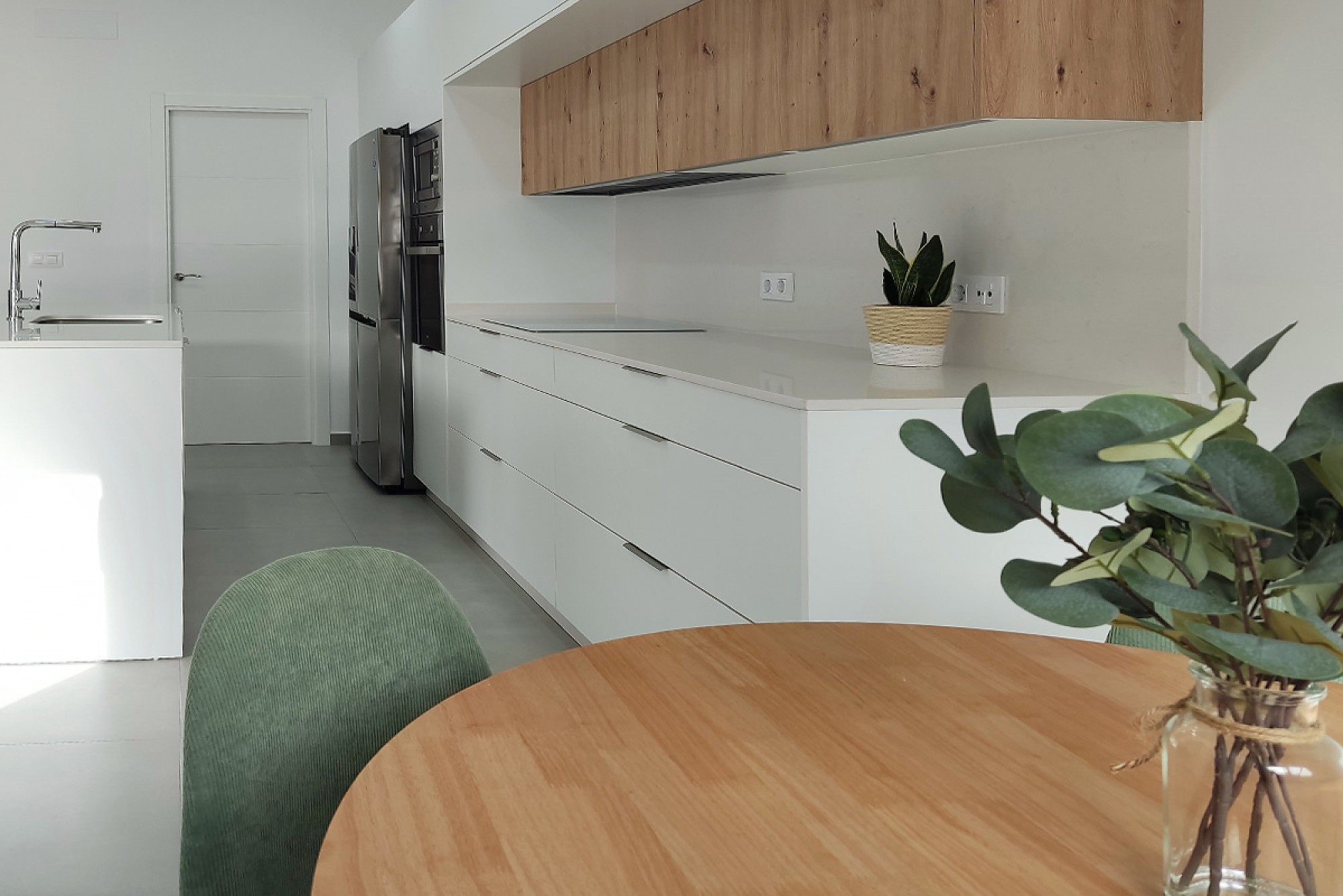 Ante esta descripción, podríamos imaginar un entorno frío, pero nada más lejos de la realidad. Para introducir un toque cálido, Nivel 2 Muebles ha combinado el modelo Cali con el Amazonas, uno de nuestros laminados con efecto roble. Ha integrado este modelo en los muebles altos. Estos son además de menor profundidad, creando un puente superior que facilite el trabajo en la zona de cocinado y cree un efecto de profundidad.