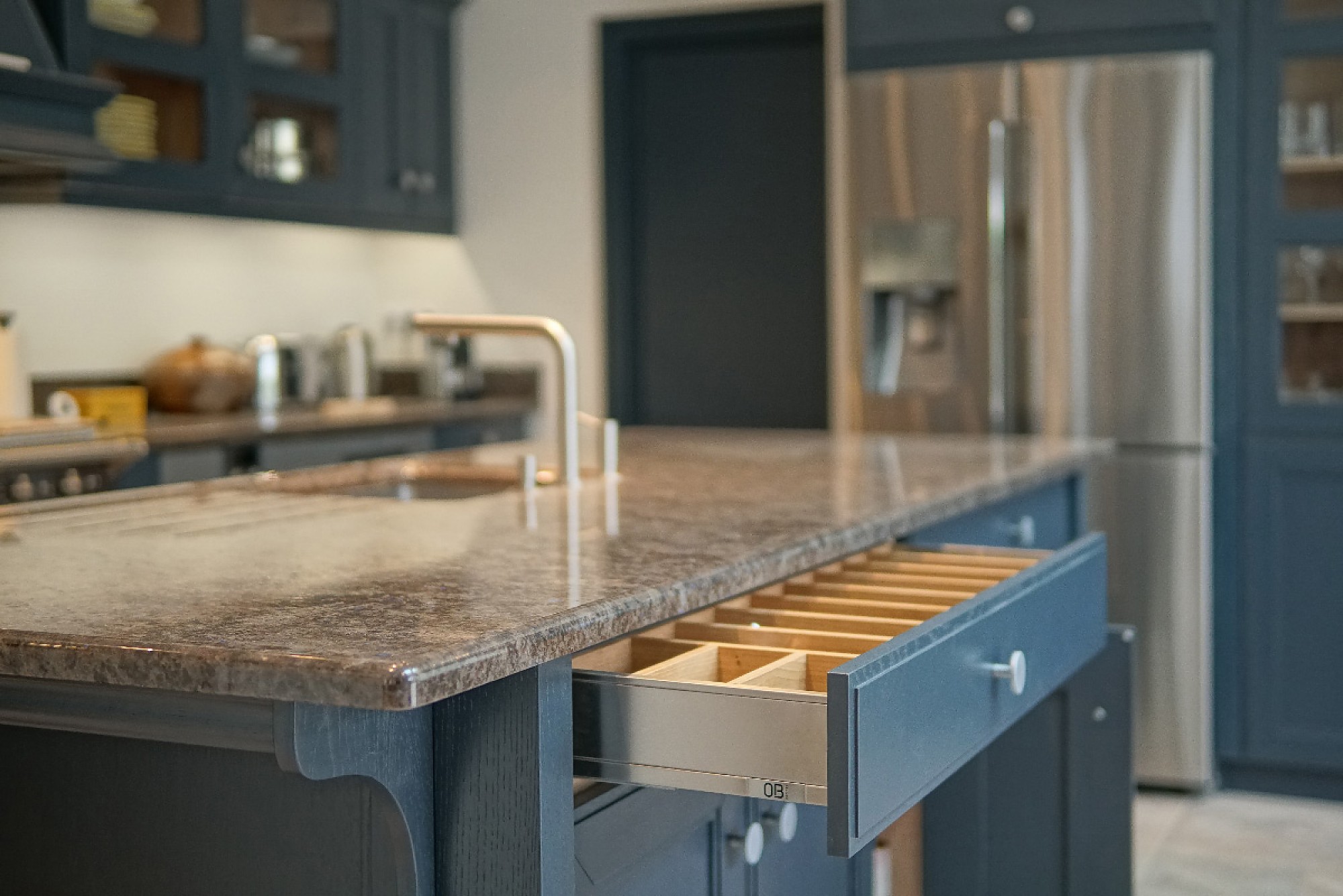 Toda la cocina tiene un sabor tradicional gracias a la decisión de nuestro distribuidor de utilizar nuestro modelo Aviano. Fabricado en madera de roble y con un marco clásico, este frente puede lacarse con efecto mate y respetando el dibujo de la veta de la madera en cualquier color de la carta R.A.L. En este caso, el color elegido es un azul petróleo oscuro, que casa a la perfección con el interior de los muebles, nuestro modelo laminado Amazonas, con efecto roble.