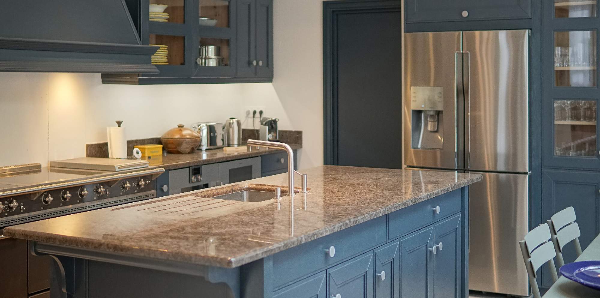 Empecemos con la distribución. El lugar destinado a la cocina es la parte inferior de un gran espacio de concepto abierto con dos alturas. Amplio y de planta cuadrada, la cocina limita en uno de sus lados con las escaleras que dan acceso al resto de la estancia y, en la pared colindante, con un espectacular ventanal con salida al jardín. Esta disposición sugería inmediatamente una distribución en L, y así lo hizo LG Agencement. En uno de los lados de esta L encontramos todo lo necesario para la preparación de alimentos, desde la imponente cocina de gas (digna de un restaurante) al horno, pasando por una gran variedad de muebles destinados al almacenamiento de utensilios e ingredientes. Todo, dispuesto en una línea de muebles bajos y altos. En la pared encontramos también una campana decorativa que nos trae recuerdos de otra época.