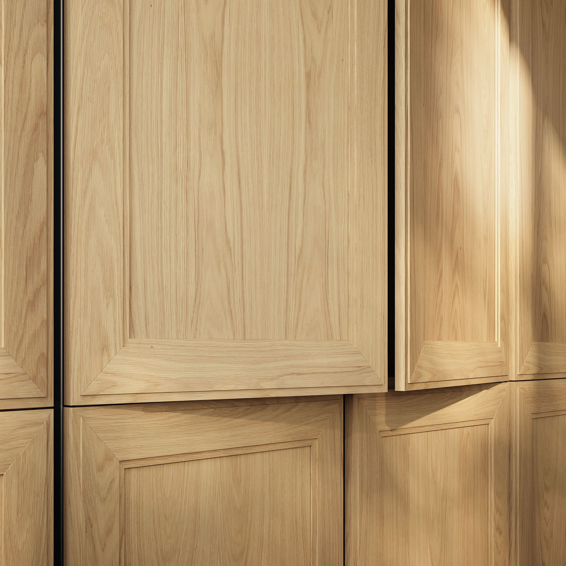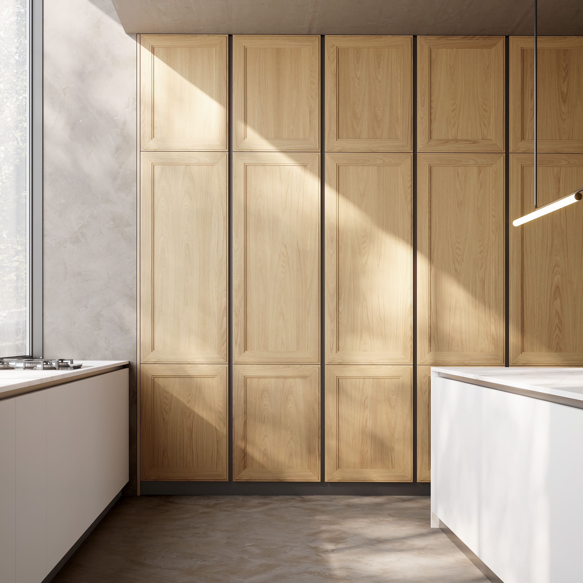 Las grandes columnas en madera estructuran la estancia con un carácter rotundo y sofisticado. Su verticalidad ordena la composición y marca un ritmo sereno, mientras la ausencia de tiradores aporta una estética limpia y minimalista. El sistema push permite que la madera se exprese con total protagonismo, sin interrupciones, consolidando una imagen refinada y contemporánea.