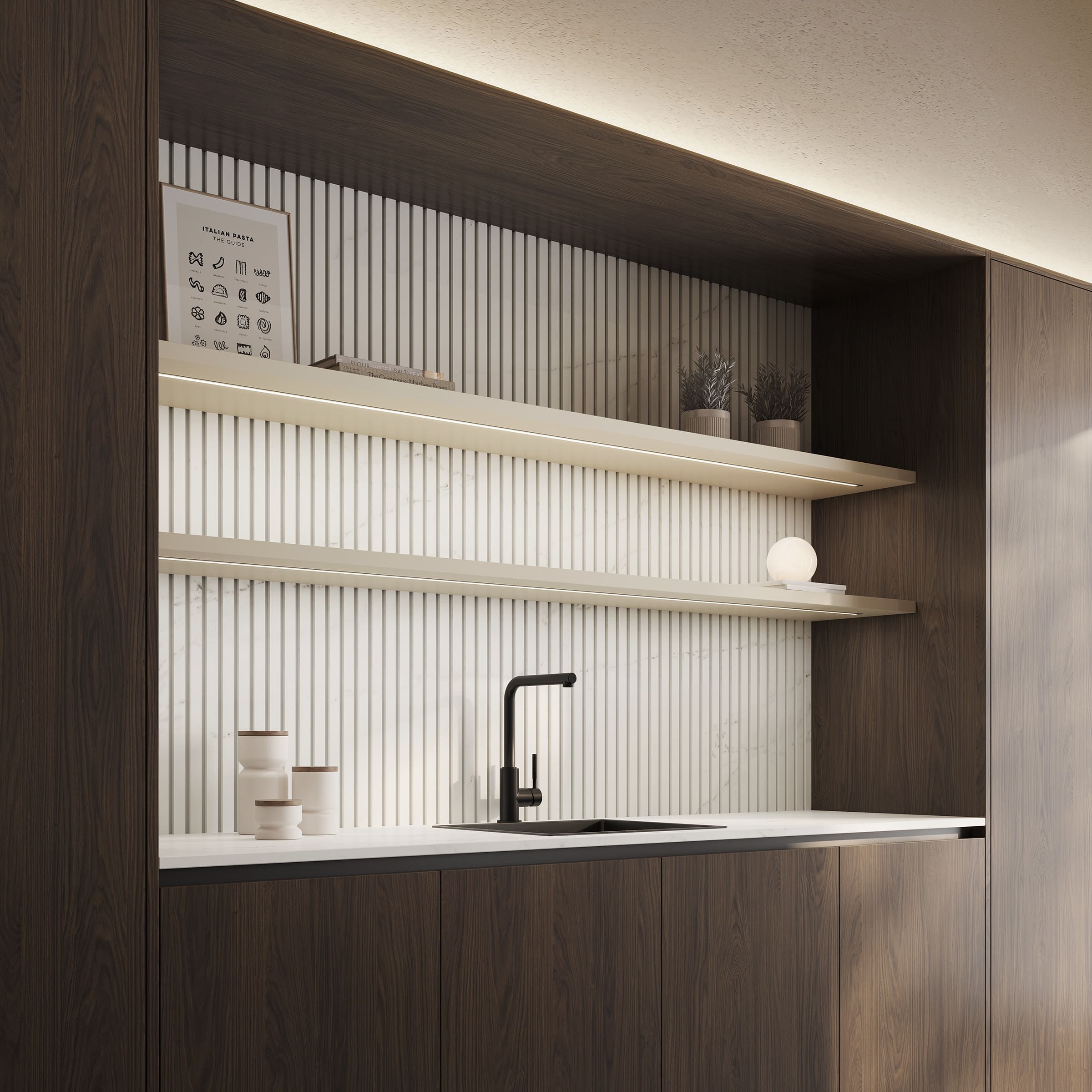 Esta cocina presenta un acabado laminado con apertura gola, que aporta una estética elegante, sin perder la calidez que transmite a primera vista. La textura y tonalidad de la madera dominan cada superficie, envolviendo el ambiente en una atmósfera acogedora.