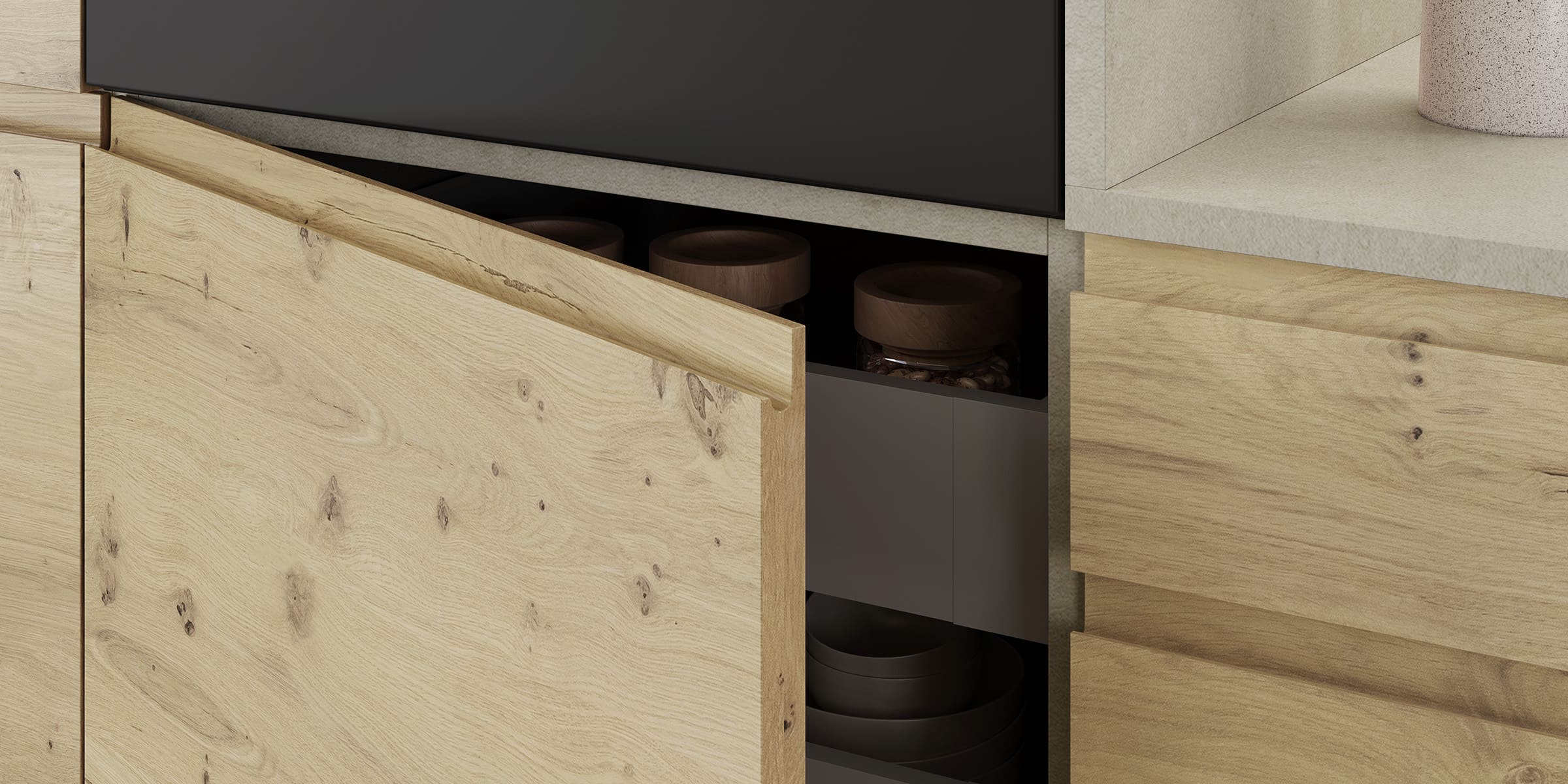 En esta cocina, el acabado en madera con se presenta como el hilo conductor de un ambiente cálido y armónico. Las vetas naturales se muestran con autenticidad, aportando una sensación orgánica que envuelve todo el espacio.