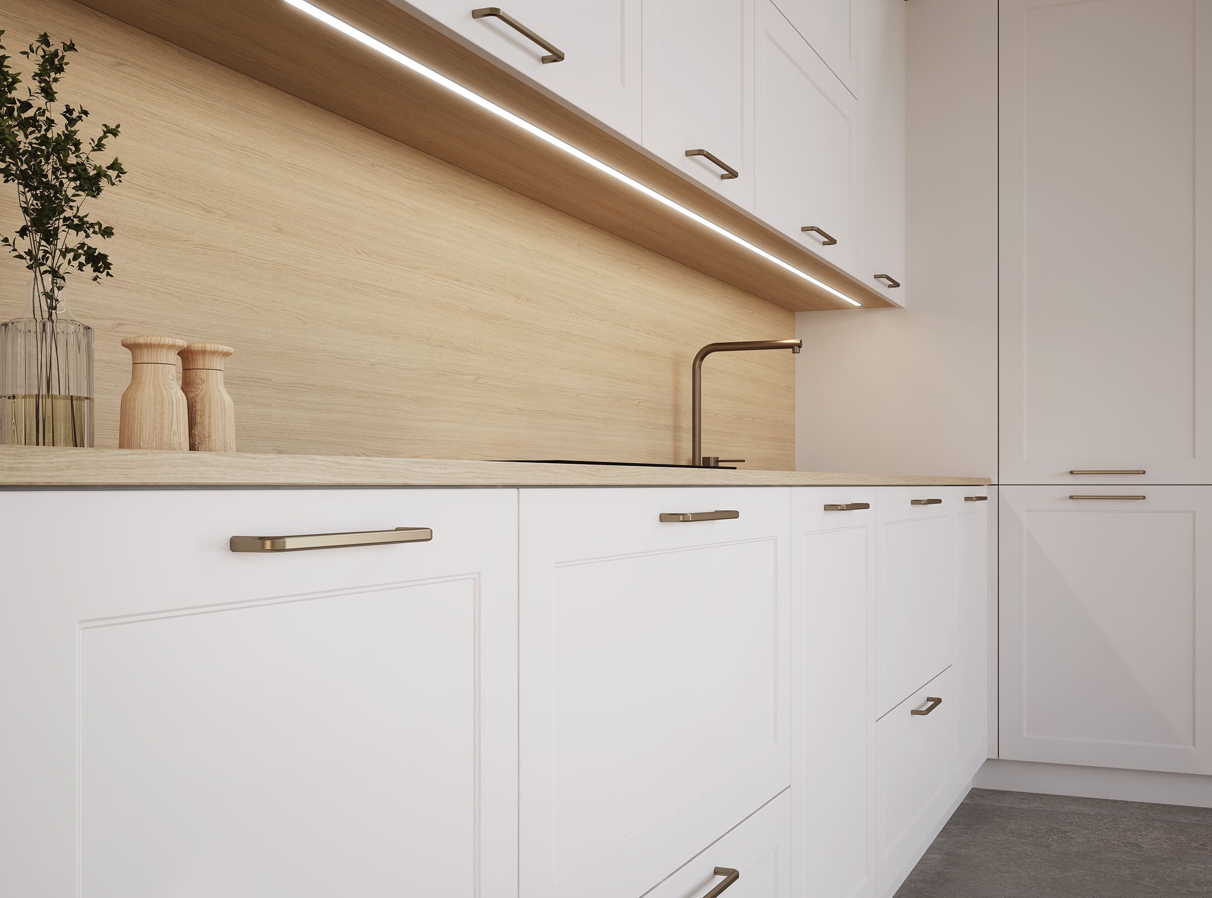 En esta cocina en L, la geometría y la luz se combinan para crear un espacio de líneas puras y equilibrio visual. El blanco, protagonista absoluto, envuelve la estancia con una elegancia serena que amplifica la sensación de amplitud. Cada plano y cada volumen se ordenan con precisión, dando lugar a una propuesta minimalista que respira calma y claridad.